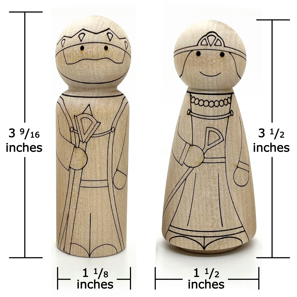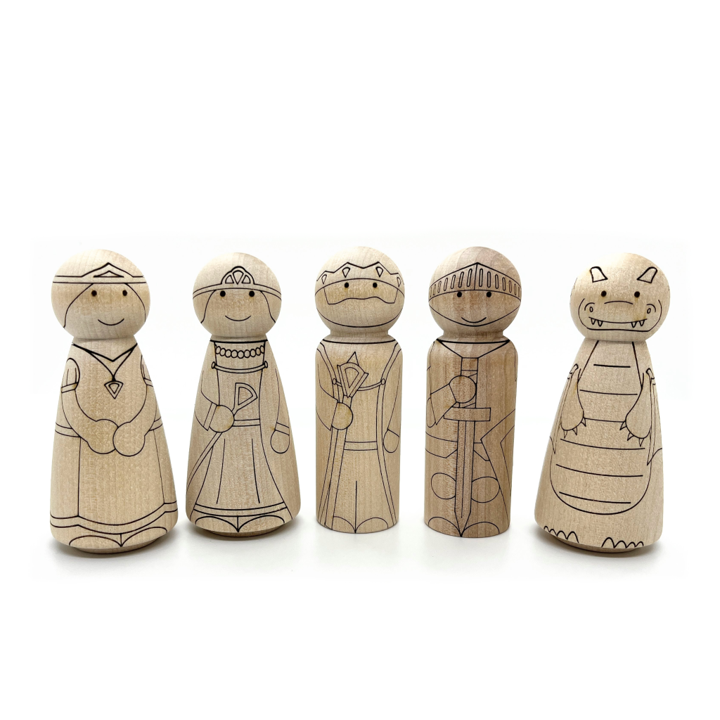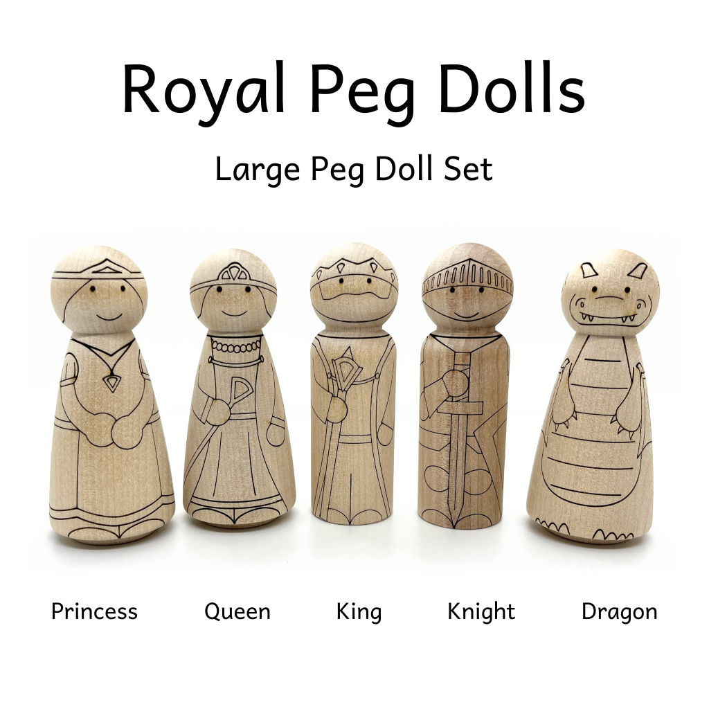 Introducing the majestic Royal Peg Doll Set, laser engraved with intricate details to resemble a King, Queen, Princess, Knight, and Dragon. Each peg doll is crafted from premium quality baltic birch wood and showcases its own unique features and characteristics.