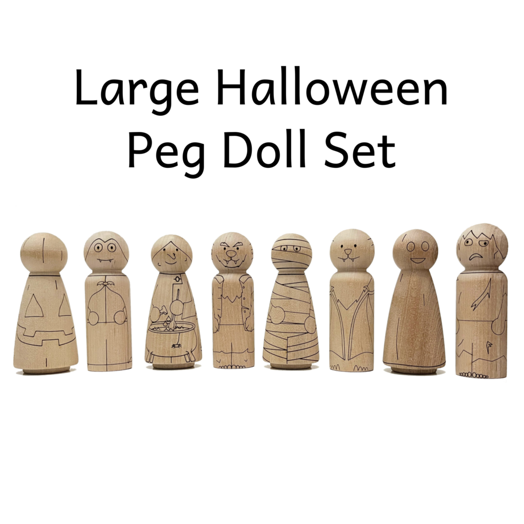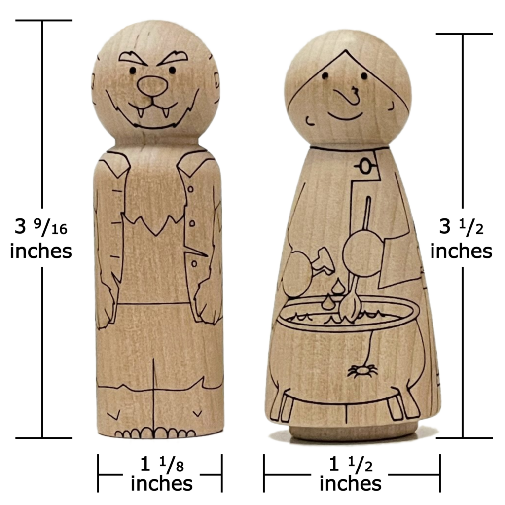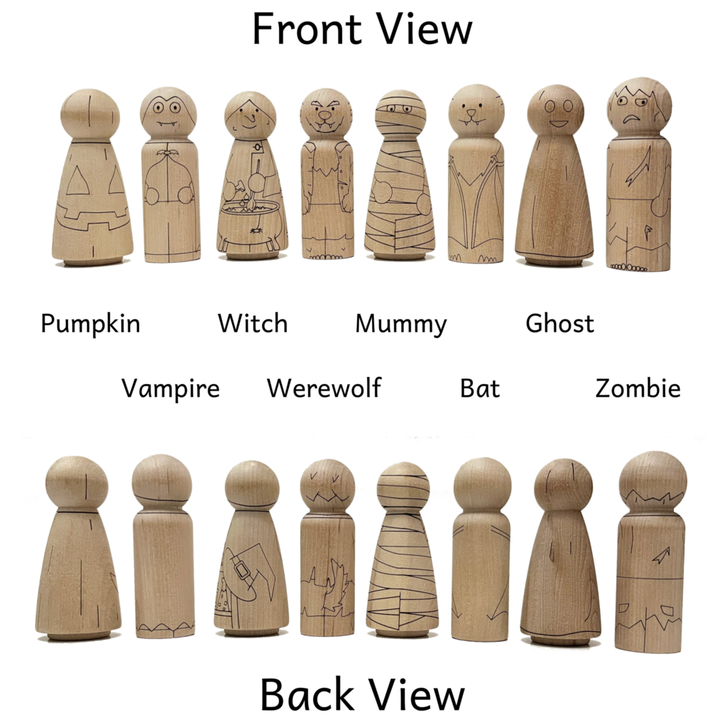 Get creative with this Halloween Peg Doll Set! Each unfinished peg doll is laser etched and engraved to resemble a cute and fun Halloween creature, including a witch, bat, pumpkin, ghost, zombie, werewolf, vampire, and mummy. These wooden peg dolls are the perfect base for your personal touch, whether you paint them, add accessories, or leave them as is. Unleash your imagination and bring these Halloween characters to life with this fun DIY project.